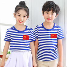 儿童装海魂衫短袖t恤夏季条纹学生班服幼儿园服男女童表演出服装 天蓝色 刺绣胸章红边国旗 100cm