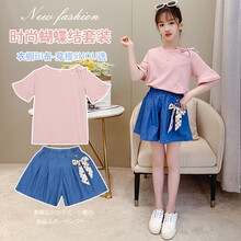 基米兔童装女儿童套装夏季小孩学生宝宝衣服2021新款中大童洋气波点条纹T恤蝴蝶结丝巾牛仔短裤两件套 粉色条纹 160cm