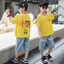 基米兔童装男儿童套装夏季宝宝小孩学生衣服2021新款中大童洋气休闲运动中国T恤牛仔短裤套装 黄色-中国套装 130cm