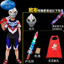 丘泽品牌童装男孩衣服夏天赛罗欧布小孩宝宝T恤童装儿童迪迦奥特曼衣服短袖套装儿童夏装夏小孩子衣服 欧布套装贈【面具手表+剑电池 +披风 130 偏...