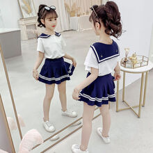 ゐℂ℘阁蓝特3儿童装水手服jk女童6学生中大童9-13岁女童套装夏装2021新款夏季学院风洋气两件套 小月亮-蓝色【T恤+百褶裙裤】 160 码【适合身高150-155】