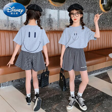 迪士尼童装女童夏季运动套装2021新款韩版中大童女孩短袖t恤格子短裤两件套洋气宽松儿童衣服6-14岁 灰色 170