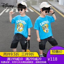 迪士尼童装男童套装2021夏装新款大童短袖T恤休闲中裤两件套韩版儿童夏季男孩小学生衣服薄款3-15岁 蓝色 130