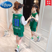 迪士尼童装女童套装篮球服儿童夏装2021新款中大童短袖T恤裤子小女孩网红洋气运动两件套夏季小学生衣服 绿色 120