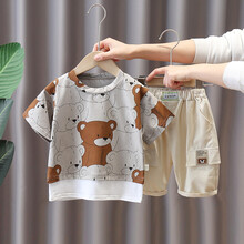 哈利城堡童装男童夏装短袖套装2021新款夏季男童宝宝洋气纯棉T恤短裤两件套夏天帅气卡通休闲儿童套装 灰色 90码
