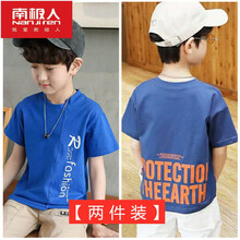 南极人棉【单件/两件装】夏季儿童短袖新款T恤衫童装男童衣服 蓝色字母+方格蓝色 140码【适合身高130厘米以下】