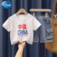 迪士尼童装【品牌自营】 儿童中国CHINA印花T恤短袖套装男童女童兄妹姐弟爱国短裤两件夏天穿的衣服 白色 90