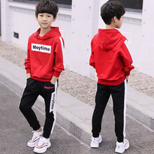 标点熊韩版新款帅气男童套装时尚儿童运动两件套洋气宝宝外套小孩卫衣中大童装长袖连帽休闲衣服中小童春秋装 布贴帽衫套红色 130码建议身高115-125