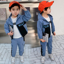 【三件套】童装男童套装2021新款儿童长裤外套三件套男宝宝秋季幼儿运动休闲1-2-3-5岁小孩衣服 蓝色 90码建议1-2岁(80-90cm)