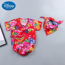 迪士尼(Disney)官方旗舰婴儿东北大花三角哈衣宝宝绵绸洋气包屁新生儿连体睡衣薄款夏婴儿衣服 红色东北大花包屁衣+三角头巾 66cm
