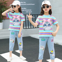 森葩女童套装夏装新款洋气2021中童大童短袖牛仔裤两件套春装时髦女孩儿童夏季女孩衣服 猫宝宝套装 150(建议身高145左右)