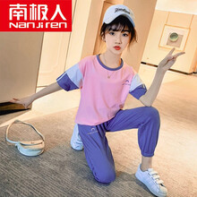 南极人童装女童套装夏装运动休闲两件套儿童套装拼色上衣T恤+运动裤洋气中大童3-12岁女孩中小学生衣服 粉红色 110