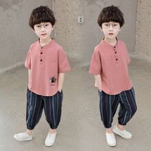 男童唐装古装夏装儿童男孩套装宝宝薄款中国风春秋汉服夏季少爷服 浅棕色 100码建议身高85-95厘米左右
