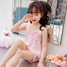 女童半袖睡衣棉绸短袖套装儿童薄款夏季绵绸吊带小女孩空调家居服宝宝 粉色小兔 120cm(120cm(建议身高105-115))