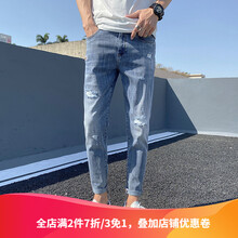 牛仔裤男2021年新款夏季薄款浅色破洞九分牛仔裤男潮牌显瘦韩版潮修身小脚裤子 K321蓝色 29(100-110斤)