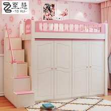 至慧家具 多功能儿童衣柜床一体床男女孩高架床成人衣帽间床组合床上床下柜 粉色床架+双衣柜+梯柜 1000*1900
