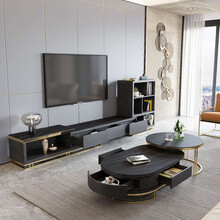 哈皮鱼茶几轻奢岩板茶几大理石茶几伸缩电视柜组合黑色长方形茶台后现代茶几地柜小户型茶桌套装客厅成套家具 高低圆茶几+伸缩电视柜【岩板面】