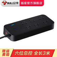 公牛 插座抗电涌独立开关过载保护防雷电脑用插座USB多功能插排 带儿童保护门家用多孔充电黑色插线板 H3060 六位总控开关全长3米