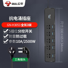 公牛插排防雷 抗电涌/防浪涌插座/排插/拖线板/接线板/插线板/防雷击多孔智能排插多功能USB充电器 GN-H3053防电涌五插位分控开关3米