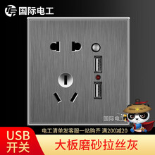 国际电工 开关插座86型暗装墙壁家用拉丝灰色二三插5五孔电源带开关USB充电插座面板