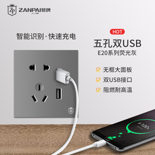 赞牌E20荧光灰色开关插座系列家用暗装5五孔带双USB插座2.1A两口手机充电二三插孔电源大面板插座 灰色2.1五孔双usb电源插座