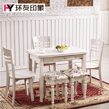 环友印象 韩式田园实木长方形小户型地中海餐桌可伸缩折叠旋转餐桌椅组合简约 象牙白一桌四椅 900*600