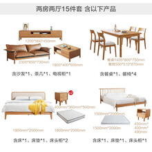 汇明创家 白蜡木全实木客厅两卧室餐厅15件套北欧风格成套家具组合两室两厅套餐 北欧白蜡木系列15件套