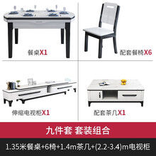 茗仕居 餐桌 实木餐桌椅组合大理石可伸缩折叠可选岩板可选带电磁炉现代简约户型长方轻奢圆形吃饭桌子 1.35一桌六椅+1.4茶几+2.2~3.4电视柜