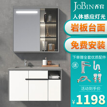 乔宾(JOBIN)实木岩板浴室柜组合套装洗脸台洗手台卫浴柜智能镜柜面盆洗漱台吊柜卫生间洗脸盆洗手盆柜 灰白三门款(配超声波人体感应灯光)-岩...