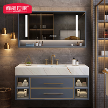 靡丽世家(MILISHIJIA)简约岩板浴室柜组合轻奢洗脸盆大理石双盆洗漱洗手盆柜组合一体北欧智能镜 二抽蓝色+岩板劳伦白金+智能镜柜 90cm
