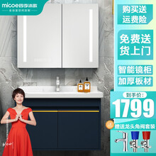 四季沐歌(MICOE)实木定制浴室柜组合套装防潮智能高清镜柜洗手盆卫生间洗脸盆柜组合洗漱台 80cm简约蓝实木浴室柜【智能高清镜】