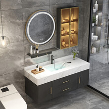 索菲特轻奢岩板一体盆浴室柜组合洗手盆柜组合卫生间智能实木洗脸盆洗漱台 70CM圆镜智能感应+岩板陶瓷盆+安装