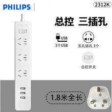 飞利浦英式插排英标转换插头插排插座转换器英国新加坡马来西亚 英标总开关 3插座 3USB 全长1.8米