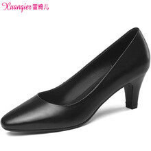 萱綺儿春秋新款真皮高跟鞋女细跟职业中跟方头单鞋女黑色通勤OL工作鞋大小码正装皮鞋 黑色6CM 35