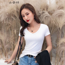 山朵棉 V领上衣女短袖T恤夏季韩版新款潮低领修身显瘦白色体恤 白色 L(97-108斤)