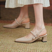帛屐小方头新款凉鞋女珍珠装饰套脚 牛津鞋女大小码粗跟女士罗马鞋女 卡其色 37