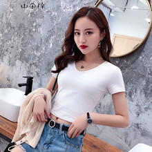 山朵棉 黑色高腰露脐紧身V领短袖T恤女性感漏脐装半袖时尚爵士舞短款体恤 白色 M( 85-96斤)