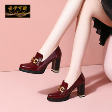 诺伊可昕防水台高跟鞋女粗跟2021年春秋季新款浅口单鞋深口大小码小皮鞋 酒红色 36