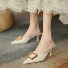 欣美百丽高跟拖鞋女夏尖头细跟凉拖鞋新款金属扣外穿一字拖猪里皮舒适懒人鞋定大小码鞋 米白色 35