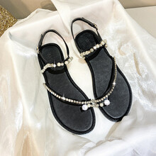 (断码清仓)红蜻蜓旗舰官方店同款夏季女平底水钻凉鞋女夏季新款休闲简约一字带珍珠装饰沙滩鞋大小码 黑色 39
