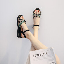 2021年夏季时尚新款罗马坡跟松糕鞋仙女风配裙厚底凉鞋女32小码女鞋33 黑色 32码