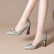 谜尚百丽高跟单鞋女粗跟性感尖头高跟鞋2020新款定制大小码甜美蝴蝶结优雅女士秋鞋 灰色 36