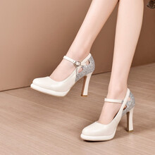 爱希仕牛皮单鞋女超高跟粗跟浅口女鞋时尚气质一字扣带职业OL工作鞋女亮片时装鞋女大码小码鞋子女 米白色 标准码 37