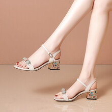 鹭尔娜粗跟凉鞋女夏牛皮漏趾中跟凉鞋韩版新款一字扣带女鞋水钻跟百搭舒适女士凉鞋可定制大小码鞋 米色 36