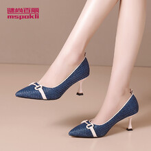 谜尚百丽尖头高跟鞋女细跟单鞋2021春季新款时尚编织革百搭小跟浅口大小码女鞋子 蓝色 35