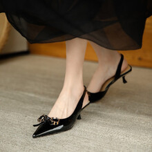 可欣百丽中跟凉鞋女夏新款包头后空四季鞋尖头蝴蝶结细跟浅口女鞋韩版细跟时装鞋定大码小码 黑色 37