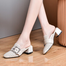 谜尚百丽夏季半拖鞋女穆勒鞋包头大小码中跟拖鞋牛皮女士凉拖鞋 米黄色软面 37
