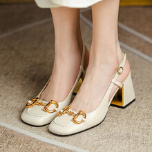 爱希仕牛皮包头凉鞋女夏新款鞋女高跟粗跟女鞋时尚气质套脚浅口时装鞋女后空春夏欧美潮可定做大码小码鞋子女 米白色 37