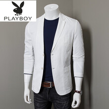 ℘花花公子品牌官方店ℑ白色西服男修身韩版潮流夏季轻薄褶皱男士小西装外套衣单西℘ HX-19035白色 180XL