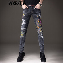 WXQKDY潮牌轻奢牛仔裤男 2021夏季新款个性印花修身小脚长裤男时尚青年轻薄透气弹力休闲牛仔裤男 黑色 28
